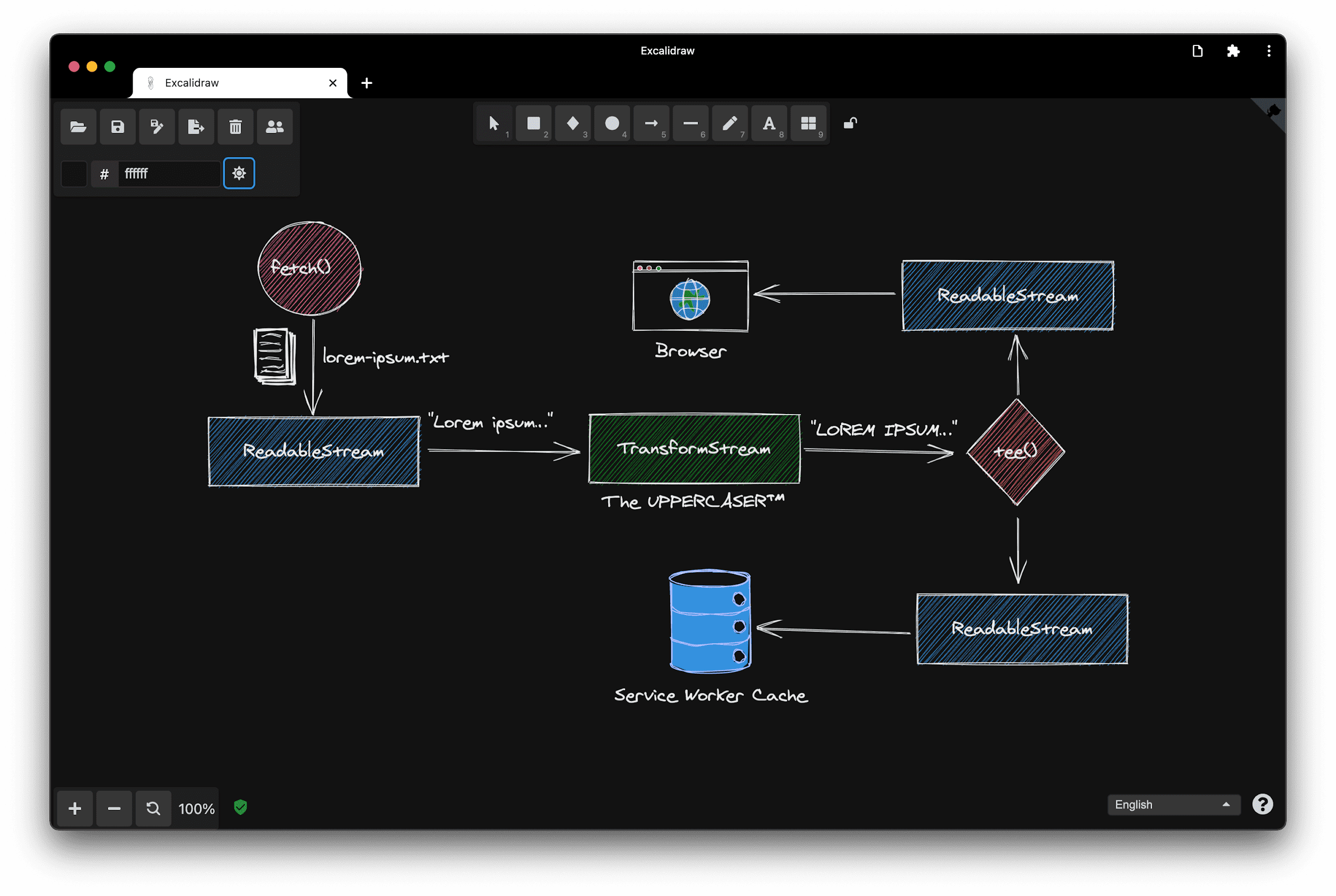 Today, Excalidraw is a full-fledged installable progressive web app with offline support, a stunning dark mode, and yes, the ability to open and save files thanks to the File System Access API.